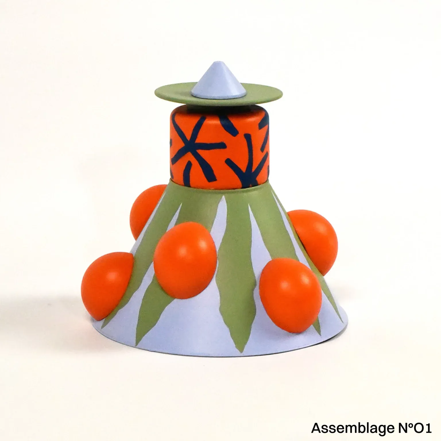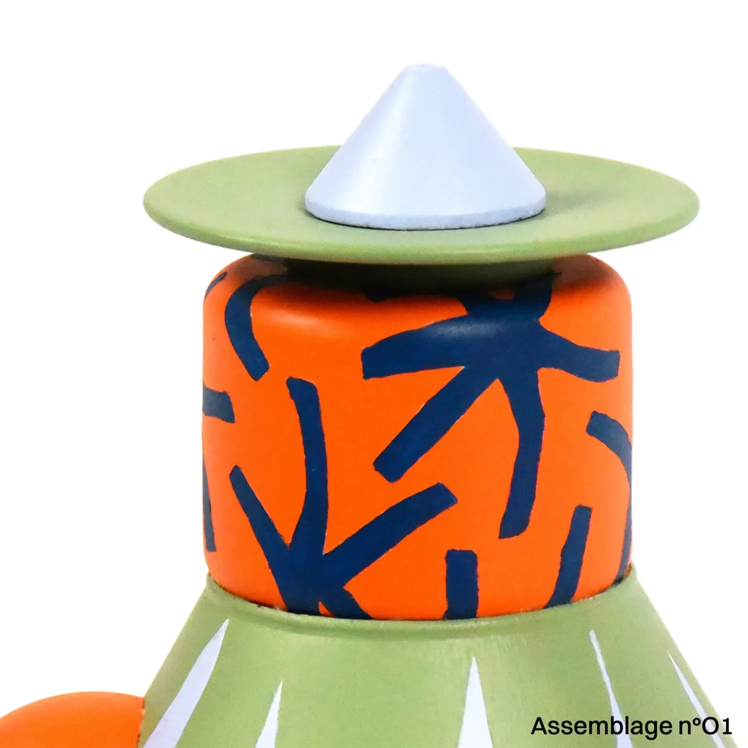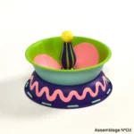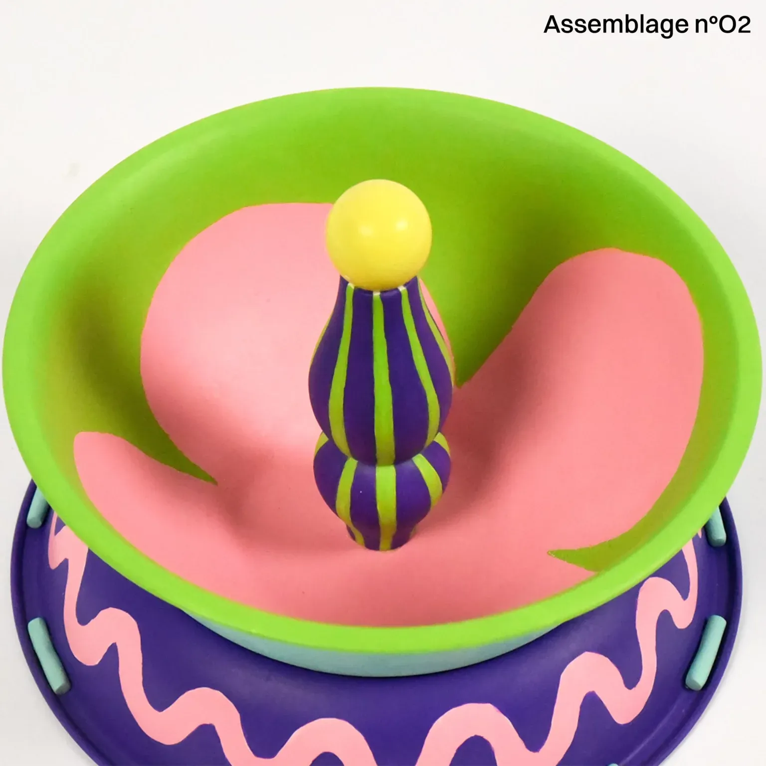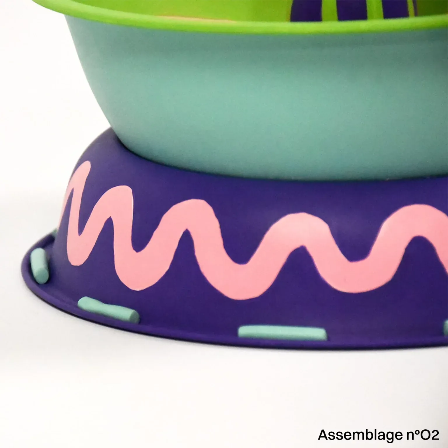 La série Assemblages est issue de son projet “Portrait-robot de l’objet qui n’existe pas”. Chaque œuvre est composée d’objets de seconde main récupérés en ressourcerie ou via des dons qui perdent ici leur usage initial et deviennent ambigus, presque illégitimes dans leur statut. Le choix des couleurs et des motifs intègre l’usage d'une intelligence artificielle.